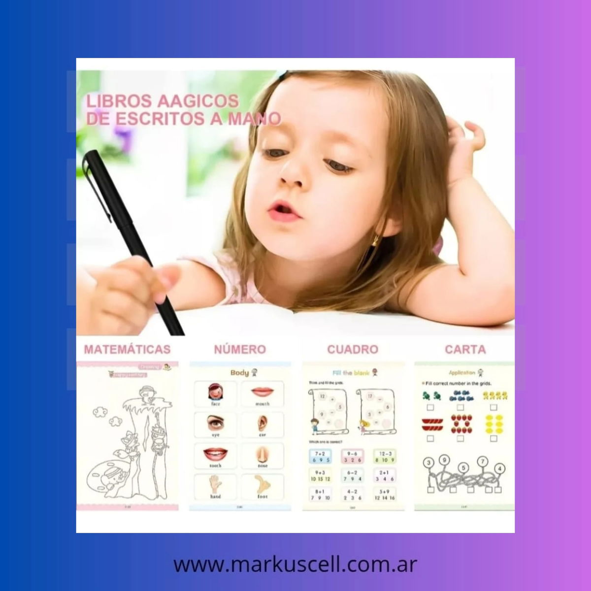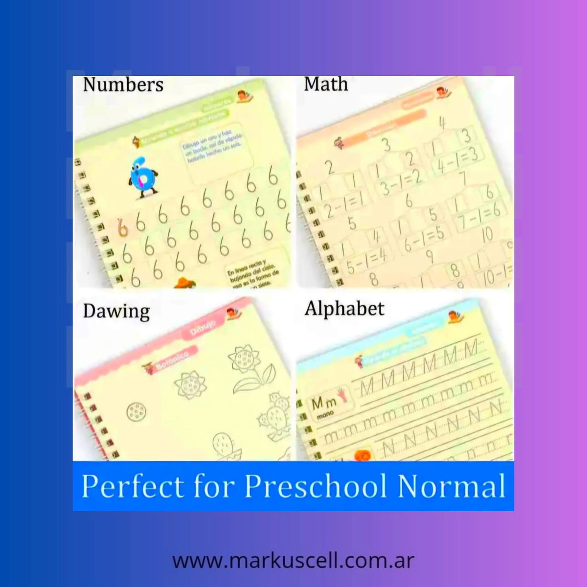 Este set incluye 4 cuadernos mágicos reutilizables en inglés para que los peques de 3 años en adelante practiquen habilidades de escritura, dibujo y cálculo de forma entretenida y didáctica.